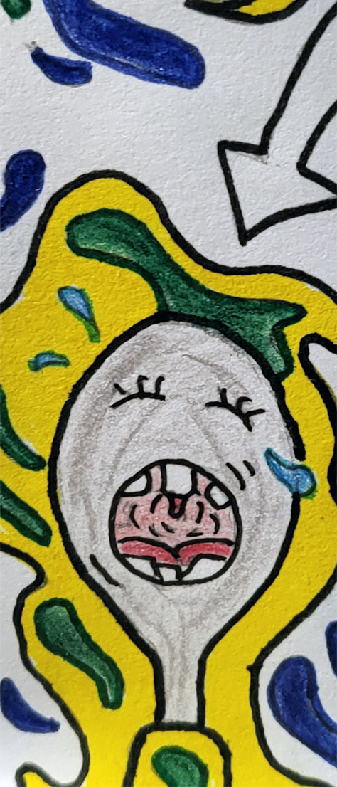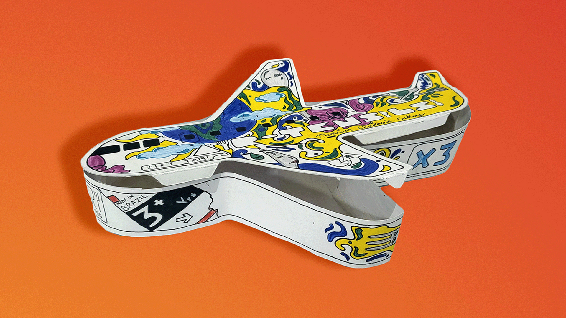 A premium children's cutlery packaging prototype, blending playful whimsy with influences from Brazilian street art.