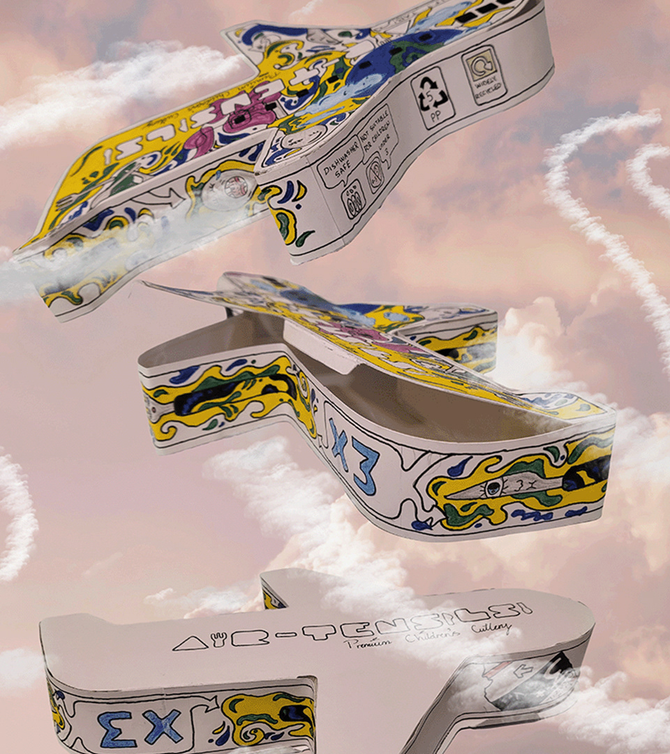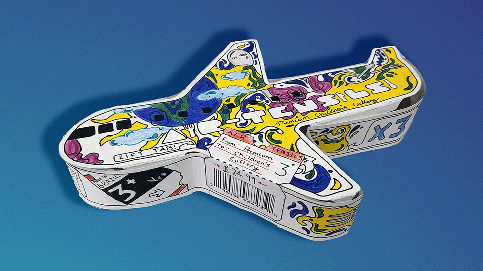 Aimed at young children, the aeroplane-shaped packaging, which houses the cutlery sold, is fun and eye-catching on supermarket shelves. Inspired by the surreal and whimsical Brazilian street artists OsGemeos, the illustrations are bold and engaging, transporting the audience on a cultural tour of Brazil.