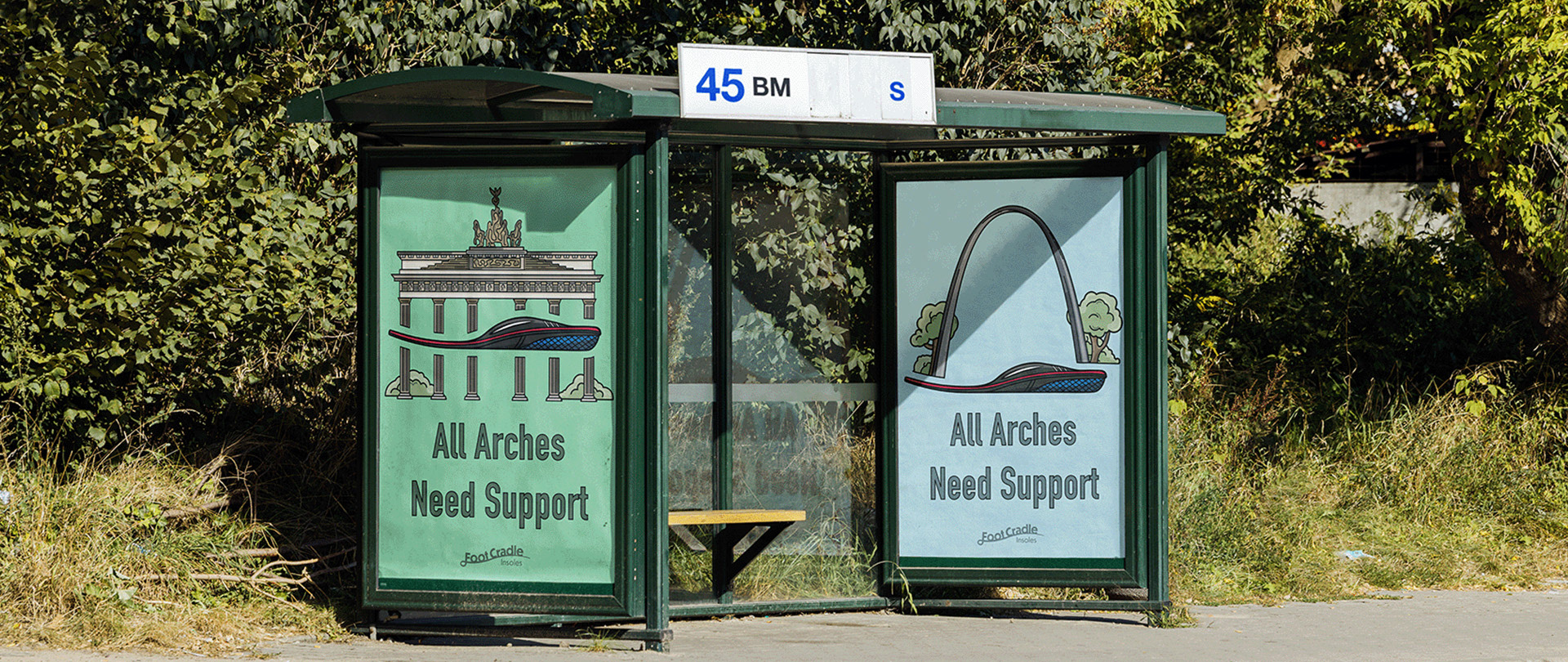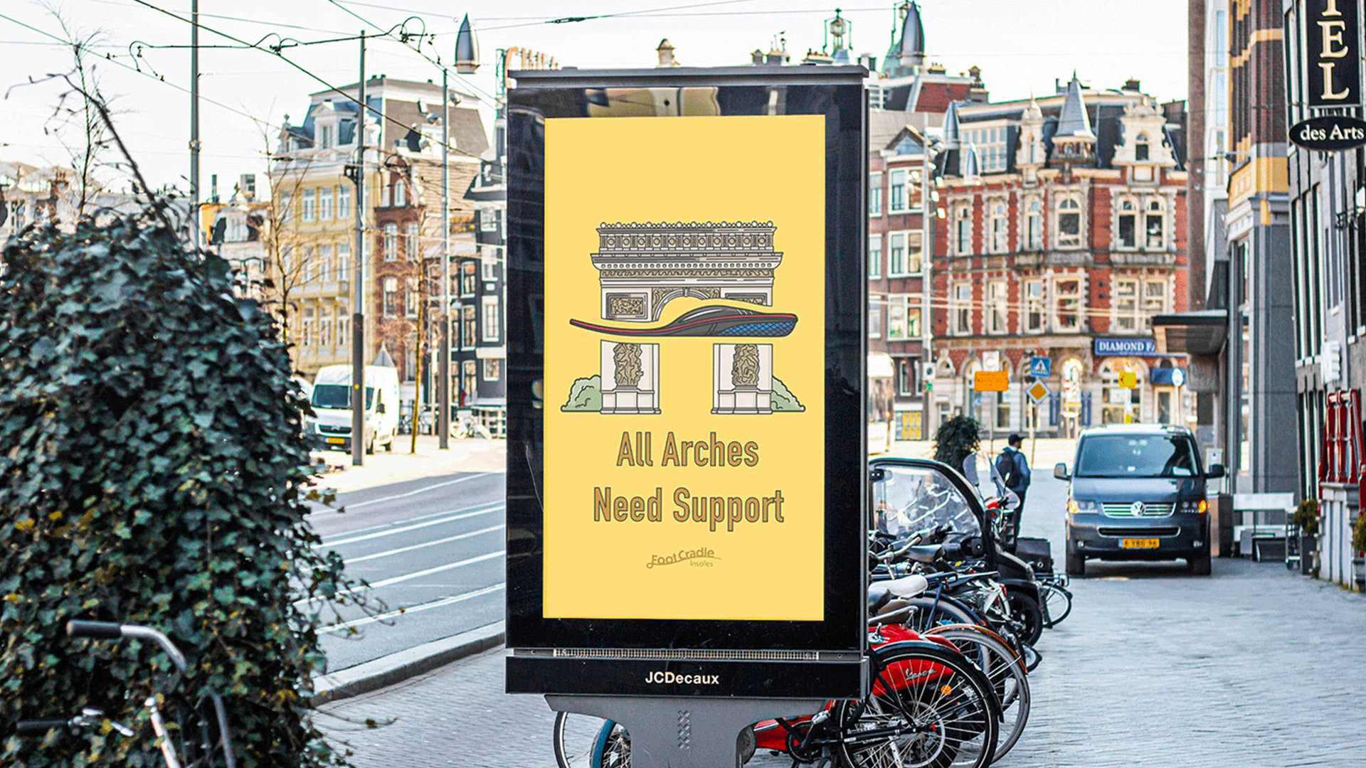A straightforward, colourfully illustrated campaign that humorously depicts famous arches from around the world being supported by shoe insoles, showing travellers that their feet deserve support. By keeping their arches pain free, they can say continue exploring cultural landmarks across the world.