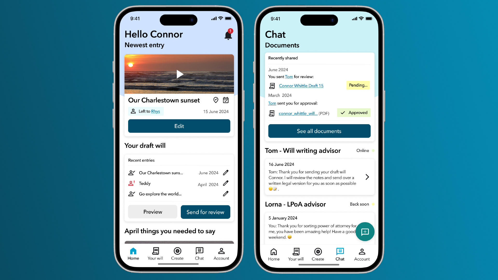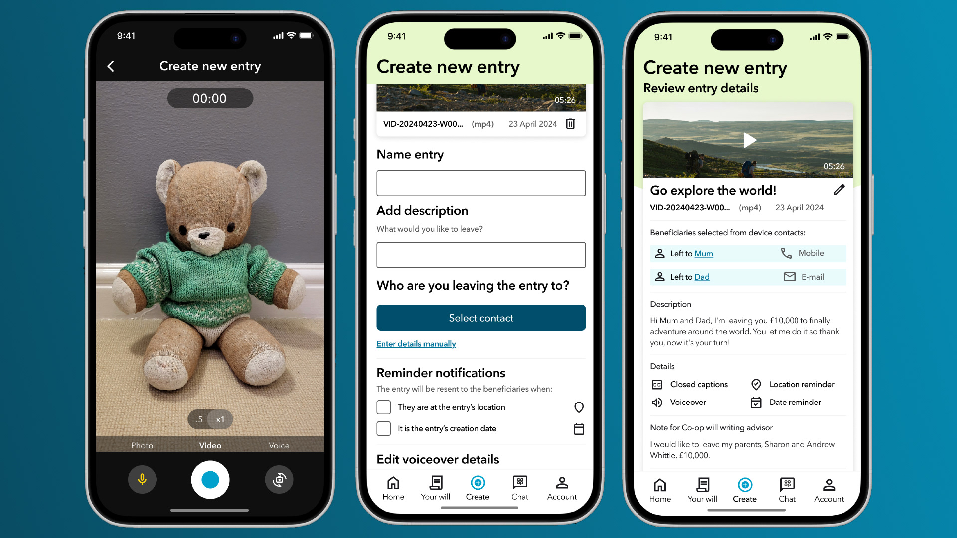 Whether you have found an old teddy in the attic or reached the peak of a mountain, record heartfelt messages to your loved ones anytime, anywhere. Choose a contact to leave your message to and let us know whether your message should add or amend your will, such as leaving money or a cherished belonging.