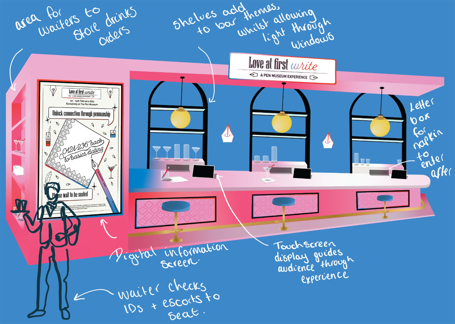Promoted on dating apps and napkins around the city, the bar installation transforms the Frederick St Museum facade. Where Cupid, a digital bartender, helps participants choose a drink that matches their personality from a pen inspired drinks menu.